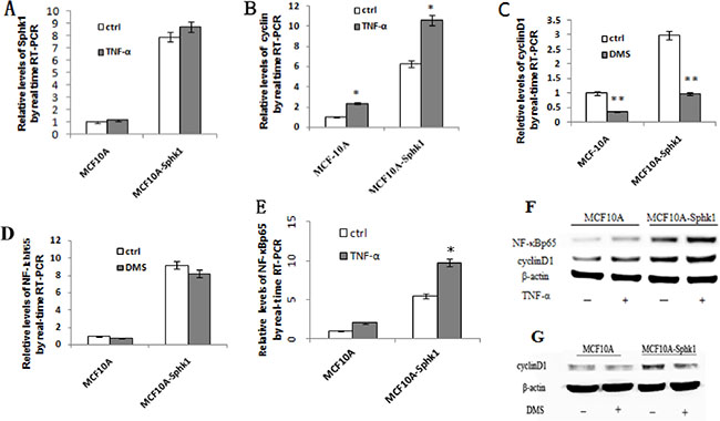 Figure 2: Activation of Sphk1/S1P signaling upregulated expression of cyclin D1 and NF-κB-p65. The effects were blocked by Sphk1 inhibition. Sphk1/S1P signaling was activated in MCF10A and MCF10A-Sphk1 cells using TNF-α, after which cells were collected for RT-PCR (A, B, E) and Western blotting (F) to quantify the expression of cyclin D1 and NF-κB-p65. The cells were also stimulated in the presence of the Sphk1 inhibitor DMS and then collected for RT-PCR (C and D) and Western blotting (G). *p < 0.05, **p < 0.01.