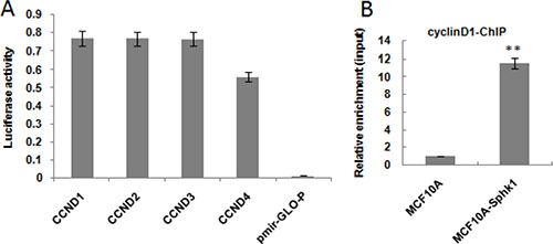 The respective truncated promoters were separately ligated into Pmir-GLO-P vector to produce CCND1-4 plasmids used to transfect MCF10A and MCF10A-Sphk1 cells. The promoter activity was assessed using a luciferase reporter system (Promega).