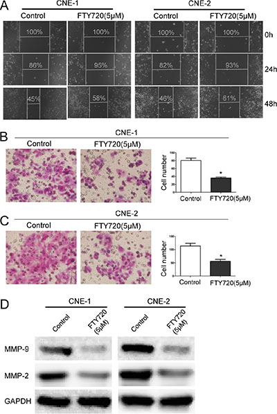 Figure 3: FTY720 inhibits migration in NPC cells. (A) FTY720 suppresses cell migration in CNE-1 and CNE-2 cells. Images of wound healing assays were captured after 0, 24 and 48 h. (B, C) The inhibitory effect of FTY720 on cell migration was confirmed using transwell migration assays in CNE-1 and CNE-2 cells. The data are shown as the mean ± S.D. of three independent experiments. *P < 0.05. (D) The protein levels of MMP-2 and MMP-9 were evaluated using Western blot analysis in CNE-1 and CNE-2 cells that were treated with 5 μM FTY720 for 24 h. GAPDH was used as a loading control. FTY720 decreased the expression of MMP-2 and MMP-9 in NPC cells.