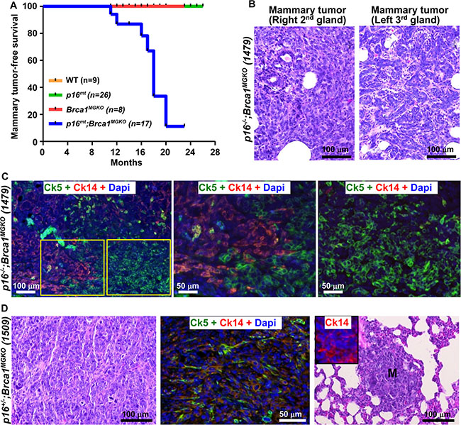 Figure 2: Characterization of primary tumors and distant metastases in mutant mice. (A) Mammary tumor-free survival curve. p16mt;Brca1MGKO includes: p16+/−;Brca1MGKO and p16−/−;Brca1MGKO mice. p16mt includes: p16+/− and p16−/− mice. Log-rank (Mantel-cox) test: p < 0.0001 (B) H.E. staining of tumors in a p16−/−;Brca1MGKO mouse (1479) at 11 months of age. Note this mouse developed two different mammary tumors. (C) Immunofluorescence staining of mammary tumors in mouse 1479 with Ck14 and Ck5. The boxed areas in the left panel are enlarged in the middle and right panels. Note the majority of tumor cells are positive for either Ck5 or Ck14. (D) Immunofluorescence and H.E. staining of mammary tumor in a p16+/−;Brca1MGKO mouse (1509) at 18 months of age. Note this tumor was comprised predominately of Ck5 and Ck14+ cells (middle panel) and developed a distant metastasis (M) to the lung (right panel), which also comprised of Ck14+ cells (inset in the right panel).