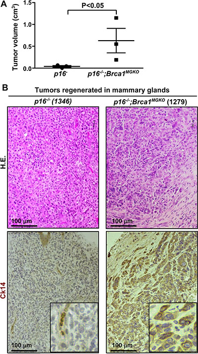 Figure 3: p16;Brca1 compound mutant tumor cells are enriched with TICs and capable of generating basal-like mammary tumors. (A) 1 × 106 cells from the tumors developed in the mammary glands of p16−/− and p16−/−;Brca1MGKO mice were transplanted into the left and right inguinal MFPs of female NSG mice, respectively. Generated tumor volume was measured 4 weeks after transplant. Results are representative of the mean ± SD of three tumors of each genotype. (B) Representative H.E. and immunostaining of Ck14 of regenerated mammary tumors.