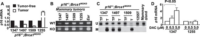 Figure 4: Promoter methylation silences p16 expression in p16+/–;Brca1MGKO tumors. (A) mRNA expression of p16 in p16+/−; Brca1MGKO mammary tumors was determined by q-RT-PCR. Corresponding tumor-free mammary tissues from the same mice were used as controls. Note the control mammary tissue for mouse 1497 tumor was from a premalignant lesion of the same mouse. Data are expressed as the mean of triplicate experiments. (B) LOH analysis of the p16 gene in p16+/−;Brca1MGKO mammary tumors. Ear DNA was used as a control. (C) Bisulphite-treated DNA from mammary tumors (T) or tumor-free mammary tissues (TF) from the same mice was analyzed for methylation of p16. U, unmethylated. M, methylated. A normal mammary gland from a WT mouse was used as a control. Note, no methylated p16 was detected in the mammary tumor developed in mouse 1255 in which the p16 mRNA level was not reduced relative to tumor-free mammary tissue of the same mouse. (D) p16 mRNA analysis in primary mammary tumor cells after treatment with DAC at 0, 0.5, or 5 μM for 72 hours.