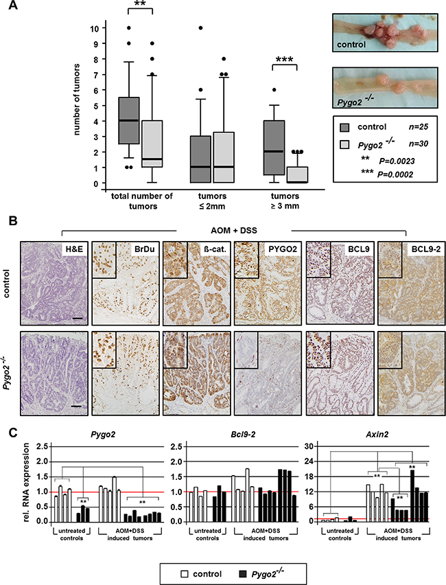 Figure 1: Knockout of Pygo2 delays the progression of chemically induced intestinal tumors. (A) Boxplot analysis illustrates number and size of colon tumors in control (Pygo2lox(ex3)/lox(ex3); n = 30) and constitutive Pygo2 deficient mice (marked with Pygo2−/− corresponding to VilCre; Pygo2Δ/Δ; n = 35). All mice were sacrificed six months after beginning with AOM and DSS treatment. Pygo2 deficient animals were compared to age-matched littermate controls. Significant difference is indicated with ** for P < 0.01 and *** for P < 0.001. Microscopic views of control and Pygo2 deficient colon tumors show tumor burden. (B) Representative H&E stains and immunostains with indicated antibodies on tumor sections from control and Pygo2 knockout animals. Scale bars in the pictures represent 200 μm for all IHC. Inserts show the staining at higher magnification. (C) qRT-PCR analyses of RNA extracted from colon tumors of control and Pygo2 deficient animals and colon tissues obtained from untreated mice with the same genotype. Each bar represents the relative RNA expression of the indicated gene for single animal; each result represents at least three independent experiments. Significances were calculated for the mean expression level compared to untreated controls and relative to the expression levels of control tumors, respectively. All significant differences are marked with * for P < 0.05 and ** for P < 0.01.