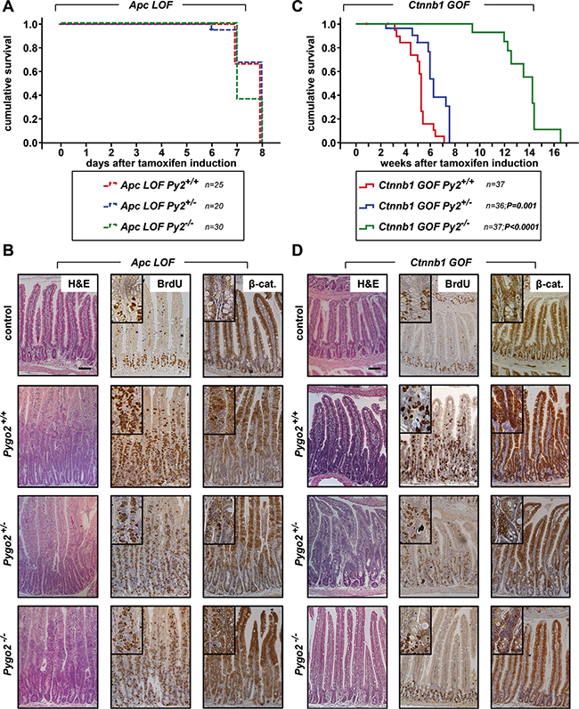We also analyzed in detail adenoma formation by the inducible loss of only one functional allele of Apc, which results in an ApcMin/+ -like phenotype [25]. We compared animals that are wild type for Pygo2 with hetero- and homozygous Pygo2 deficient animals (Supplementary Figure S2). Survival and tumor development of animals was monitored and adenoma were analyzed by immunohistochemistry. Deletion of one or two alleles of Pygo2 did not significantly change the overall survival of Apc mutant animals, which died between six and seven months post induction (Supplementary Figure S2A). Analyses of the intestines of mutant animals revealed that the tissues exhibited multiple small adenoma without any gross difference between Pygo2 wild type and knockout (not shown). Loss of PYGO2 expression in the adenoma was confirmed by immunohistochemistry in Pygo2 deficient animals. Moreover, all adenoma of the analyzed genotypes were highly proliferative, showed expression of nuclear ß-catenin and upregulation of BCL9-2 (Supplementary Figure S2B). Thus, Pygo2 ablation apparently cannot prevent adenoma formation that is genetically induced by loss of one functional Apc allele in vivo, which also exhibits loss of the second allele due to loss-of-heterozygosity (LOH) [30, 31].