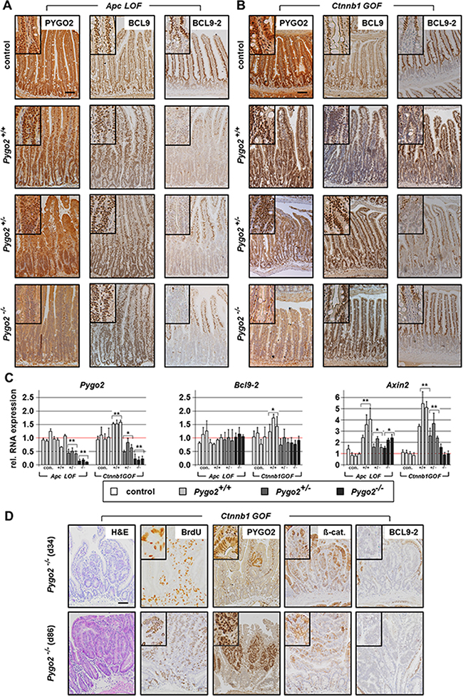Figure 3: Analysis of Pygo2, Bcl9 co-factors, and Axin2 in Apc LOF and Ctnnb1 GOF mutants; failed Pygo2 deletion by recombination induced microadenoma formation in Ctnnb1 GOF-Pygo2 deficient animals. (A, B) Immunostainings with indicated antibodies on intestinal tissue sections from compound Apc homozygous LOF mice (A) and heterozygous Ctnnb1 GOF animals (B) with wild type Pygo2 expression and hetero- and homozygous Pygo2 ablation. The upper panel shows the same stains from controls. (C) qRT-PCR analyses show RNA expression of Pygo2, Bcl9-2 and Axin2. RNA is extracted from intestinal epithelial cells of Apc LOF mutants on day 6 and Ctnnb1 GOF mutants on day 18 post induction. Each bar represents one animal. Significances were calculated for the mean expression level compared to the respective control group. The significant differences are marked with * for P < 0.05, and ** for P < 0.01. (D) H&E stains and immunohistochemical analyses of intestinal tissues from compound Pygo2 deficient Ctnnb1 GOF mice, which were sacrificed on day 34 and day 86. Note that the intestine shows small areas with expression of PYGO2 (upper panel). These animals develop at later stages multiple microadenoma (lower panel) that express PYGO2, but not BCL9-2, with increased BrdU staining and concomitant nuclear ß-catenin. Scale bars in the pictures represent 200 μm for all IHC. Inserts show the staining at higher magnification.