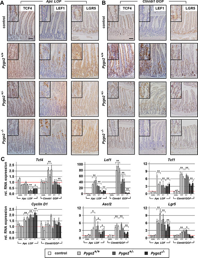 Figure 4: Pygo2 ablation downregulates different Wnt/ß-catenin target genes overexpressed during intestinal hyperproliferation induced by Apc LOF and Ctnnb1 GOF. (A, B) Representative Immunostains with the indicated antibodies on intestinal tissue sections from compound homozygous Apc LOF mice (A) and heterozygous Ctnnb1 GOF animals (B). The upper panel shows the stainings from controls. Pictures from immunostains of compound mutant animals with wild type Pygo2 expression and hetero- and homozygous Pygo2 ablation are provided below. Scale bars in the pictures represent 200 μm for all IHC. Inserts show the staining at higher magnification. (C) Relative RNA expression of Wnt/ß-catenin target genes in Apc LOF and Ctnnb1 GOF mutant animals. qRT-PCR was performed with RNA extracted from intestinal epithelial cells of compound mutant animals as indicated below the graphs. Significances are marked with *P < 0.05, and **P < 0.01 for the mean expression level compared to the respective control group.