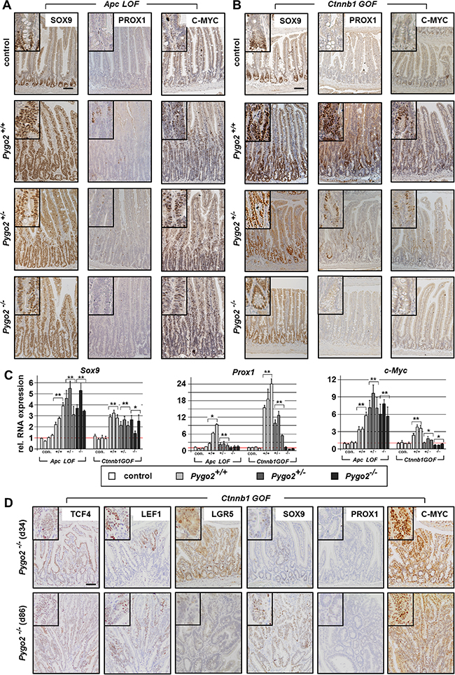 Figure 5: Pygo2 ablation completely suppresses the upregulation of Prox1, but fails to decrease the overexpression of c-Myc during early intestinal tumorigenesis in Apc LOF mice. (A, B) Immunostains for detecting tumor progression markers SOX9, PROX1 and C-MYC on intestinal tissue sections of compound Apc LOF (A) and Ctnnb1 GOF animals (B). (C) qRT-PCR analyses for the relative RNA expression of Sox9, Prox1 and C-myc. Each bar represents one animal. Each graph represents the mean of at least three independent experiments from RNA of mice with the indicated genotype. Significant difference for the mean expression level relative to the corresponding control group is marked * for P < 0.05, and ** for P < 0.01. (D) Immunohistochemical analyses of intestinal tissues from compound Pygo2 deficient Ctnnb1 GOF mice on day 34 and day 86 post induction. Sections were stained with indicated antibodies for detecting Wnt/ß-catenin targets and tumor progression markers. Note that microadenoma also do not express PROX1, but show overexpression of C-MYC in the adenomatous cells. Scale bars in the pictures represent 200 μm for all IHC. Inserts show the staining at higher magnification.