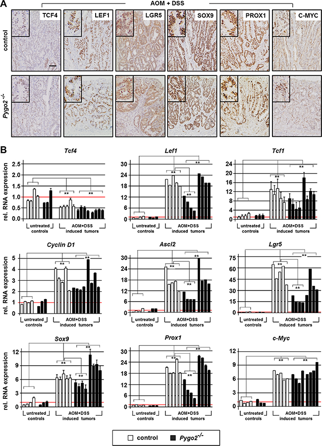 Figure 6: Knockout of Pygo2 downregulates overexpressed Wnt/ß-catenin targets and tumor progression genes in a subgroup of Pygo2 deficient chemically induced intestinal tumors. (A) Representative immunohistochemical stainings of chemically induced intestinal tumors for the indicated markers. Tissues from controls (Pygo2lox(ex3)/lox(ex3)) and Pygo2 knockout animals (VilCre; Pygo2Δ/Δ) were collected six months after treatment with AOM and DSS. Scale bars in the pictures represent 200 μm for all IHC. Inserts show the staining at higher magnification. (B) qRT-PCR analyses of RNA extracted from tumors and from colon tissues of untreated mice, both of controls and Pygo2 deficient animals. Each graph shows the relative RNA expression of the indicated gene for one single animal. Significances were calculated for the mean expression level compared to untreated controls and relative to the expression levels of control tumors, respectively. ** marks significant differences between the respective groups with P < 0.01.