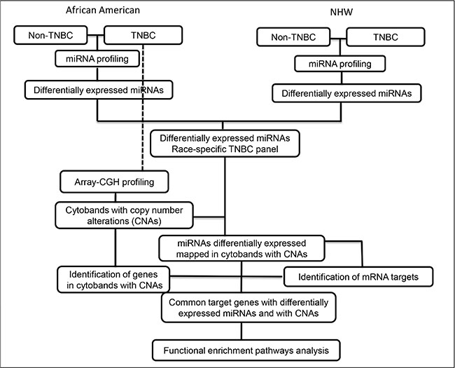 Figure 1: Workflow of miRNA expression and copy number profiling and downstream comprehensive computational analysis performed in the TNBC and non-TNBC cases of AA and NHW group of patients.