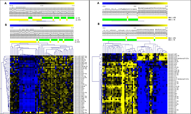 Figure 2: Unsupervised (A) and Supervised (B) Hierarchical Clustering analysis applied to the TNBC (green bars) and non-TNBC (yellow bars) cases of the AA and NHW group of patients (left and right panel respectively). Up-regulated miRNAs (yellow) and down-regulated miRNAs (blue). (MeV4.9; Pearson correlation, P < 0.01, FDR < 0.05).