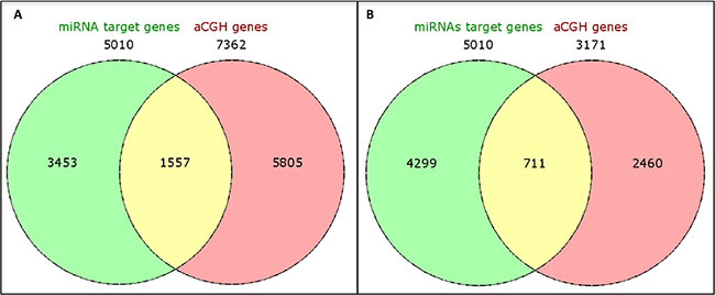 DNA copy number analysis was performed using an oligonucleotide array-CGH platform (SurePrint G3 Human CGH Microarray 8x60K; Agilent Technologies Inc., Santa Clara, CA), according to the protocol for FFPE samples that we have established in our lab [70]. DNA was isolated from consecutive FFPE sections of the cases profiled for miRNA. DNA isolated from peripheral blood from multiple normal individuals was used as control DNA. The array data was analyzed using the Feature Extraction (FE) v.10.10 and Agilent CGH Analytics v.7.0 software (Agilent Technologies Inc., Santa Clara, CA), using the ADM-2 algorithm, threshold 6.0 and an aberration filter with a minimum number > 3 probes. Gene amplifications and deletions were defined as minimum average absolute log2 ratio (intensity of the Cy5 dye (reference DNA)/intensity of the Cy3 dye (test DNA) value of > 0.25 and <−0.25, respectively, as per the CGH analytics analysis.