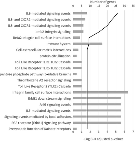 Figure 3: Signaling pathway analysis of the differentially expressed genes in the group of samples with more than 100 Mb of DNA involved in CNAs. The 20 most significant pathways are shown. The black line represents the log Benjamini–Hochberg adjusted p-value.