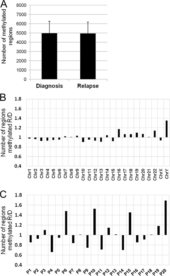 Figure 4: DNA methylation changes between relapse and diagnosis. (A) Number of methylated regions (mean ± standard deviation) in the 20 paired samples (diagnosis vs relapse). (B) Ratio of the number of methylated regions between relapse and diagnosis chromosome-by-chromosome. X axis, chromosomes; Y axis, fold change of methylated regions. (C) Ratio of the number of methylated regions between relapse and diagnosis for each pair of samples. X axis, sample identification; Y axis, fold change of methylated regions.