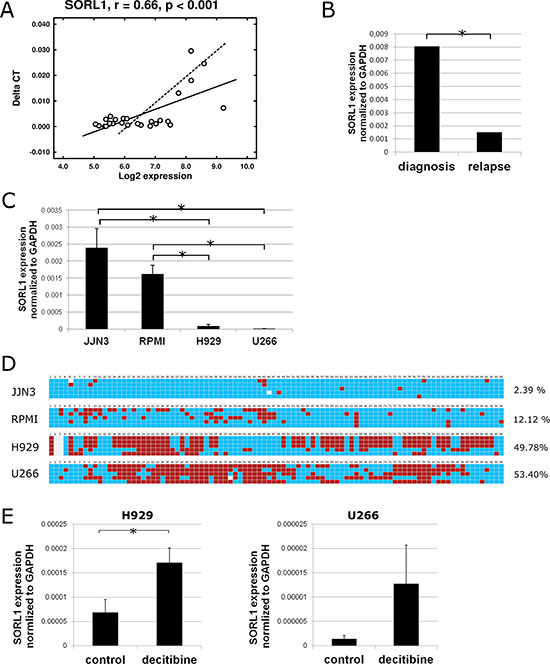 Figure 5: Expression and DNA methylation status of SORL1 gene. (A) Pearson correlation of SORL1 gene expression measured by qRT-PCR (Taqman) and by microarrays in 34 MM samples (17 paired samples). (B) Expression of SORL1 gene measured by qRT-PCR at diagnosis and relapse (17 paired samples). (C) Expression of SORL1 gene assessed by qRT-PCR in 4 MM cell lines. Results are normalized to the expression of GAPDH. Results are shown as ∆Ct and are the average of three independent experiments. (D) DNA methylation status of part of CpG island present in the 5′ UTR region of the SORL1 gene in H929 and U266 cell lines. Blue square: unmethylated CpG; red square: methylated CpG. Only CpGs are shown. Each line shows one sequenced clone. The percentages indicate percentage of methylated CpGs (average of 5 replicates). (E) SORL1 expression after decitabine (1 μM, 72 h) treatment of H929 and U266 cell lines. Control-cells treated with DMSO. Results are the average of three independent experiments. *p < 0.05 (Student’s t test).