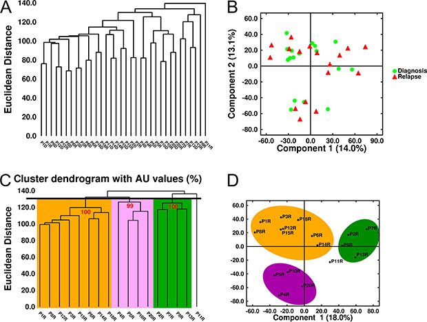 Figure 7: Unsupervised analysis of gene expression in MM samples. (A) Hierarchical dendrogram and (B) Multidimensional scaling of 34 MM samples (17 paired samples) based on the expression of 33297 genes. (C) Hierarchical dendrogram plot adjusted to show the AU (Approximately Unbiased) p-values (red digits). (D) Multidimensional scaling of the 17 relapse samples. Three clusters were identified with a Euclidean distance of ~130.