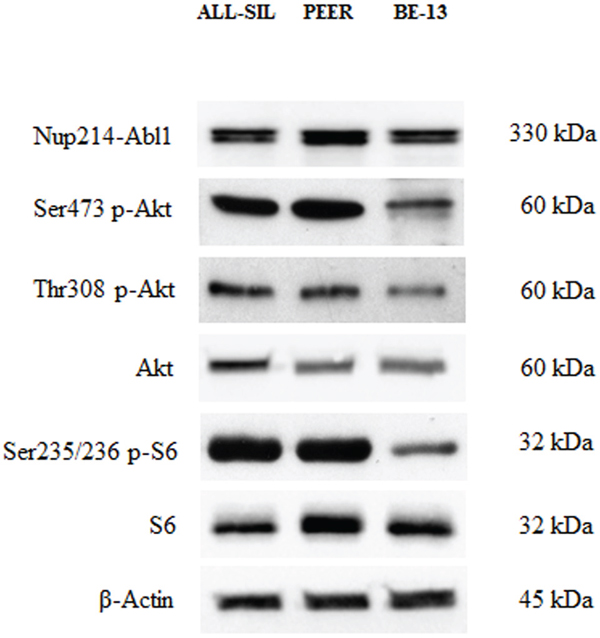 Figure 1: Expression and phosphorylation status of Akt and of the mTORC1 downstream target S6 in NUP214-ABL1 positive T-ALL cell lines. Western blot analysis of ALL-SIL, PEER and BE-13 cell lines to detect the expression and phosphorylation levels of NUP214-ABL1, Akt and S6 proteins. Twenty-five μg of protein were blotted on each lane. Antibody to β-Actin served as loading control.