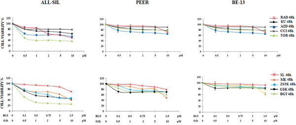 Figure 2: Cytotoxic activity of PI3K/Akt/mTOR inhibitors in ALL-SIL, PEER and BE-13 cell lines. MTS assays of ALL-SIL, PEER and BE-13 cell lines treated with increasing concentrations of PI3K/Akt/mTOR inhibitors for 48 h. Torin-2 and BGT226 appeared to be the most effective drugs for both cell lines. SD was less than 10%. Concentration of drugs is indicated in the X axis. O.D. is the abbreviation of Other Drugs. One representative experiments of three is shown. Abbreviations: RAD001, KU0063794, AZD8055, CCI-779, Torin-2, XL-147, MK-2206, ZSTK474, GSK690693 and BGT226 were abbreviated respectively as follows: RAD, KU, AZD, CCI, TOR, XL, MK, ZSTK, GSK and BGT.