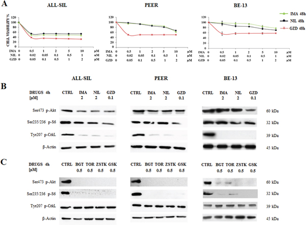 Figure 3: Effectiveness of Imatinib, Nilotinib and GZD824 in ALL-SIL, PEER and BE-13 cell lines. A. T-ALL cell lines were treated with increasing concentrations of Imatinib, Nilotinib and GZD824 for 48 h. In PEER and BE-13 cells Imatinib and Nilotinib showed less potency, while the effectiveness of GZD824 was confirmed. SD was less than 10%. B. Western blot analysis of phosphorylated Akt, S6 and CrkL in T-ALL cell lines treated for 4 h with 2 μM Imatinib or Nilotinib or 0.1 μM GZD824. Twenty-five μg of protein were blotted to each lane. β-Actin documented equal lane loading. Imatinib, Nilotinib and GZD824 were abbreviated in IMA, NIL and GZD. C. Western blot analysis of phosphorylated Akt, S6 and CrkL in T-ALL cell lines treated for 4 h with 0.5 μM of BGT226, Torin-2, ZSTK474 and GSK690693. β-Actin served as loading control. BGT226, Torin-2, ZSTK474 and GSK690693 were abbreviated in BGT, TOR, ZSTK and GSK, respectively.