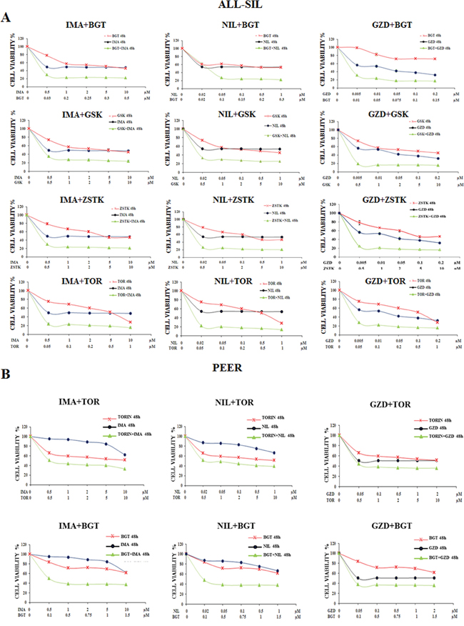 Figure 4: Synergism of Imatinib, Nilotinib and GZD824 with BGT226, GSK690693, ZSTK474 and Torin-2 in ALL-SIL and PEER cells. A. MTS assays of ALL-SIL cell lines treated for 48 h with increasing concentrations of Imatinib, Nilotinib and GZD inhibitors in combination with BGT226, GSK690693, ZSTK474 and Torin-2 for 48 h. B. MTS assays of PEER cell lines treated for 48 h with increasing concentrations of Nilotinib, Imatinib and GZD824 inhibitors either in combination with BGT226 and Torin-2 for 48 h. Concentration of each drug is reported under the graphs. SD was less than 8%. One representative experiment of three is shown. Imatinib, Nilotinib, GZD824, BGT226, Torin-2, ZSTK474 and GSK690693 were abbreviated in IMA, NIL, GZD, BGT, TOR, ZSTK and GSK.