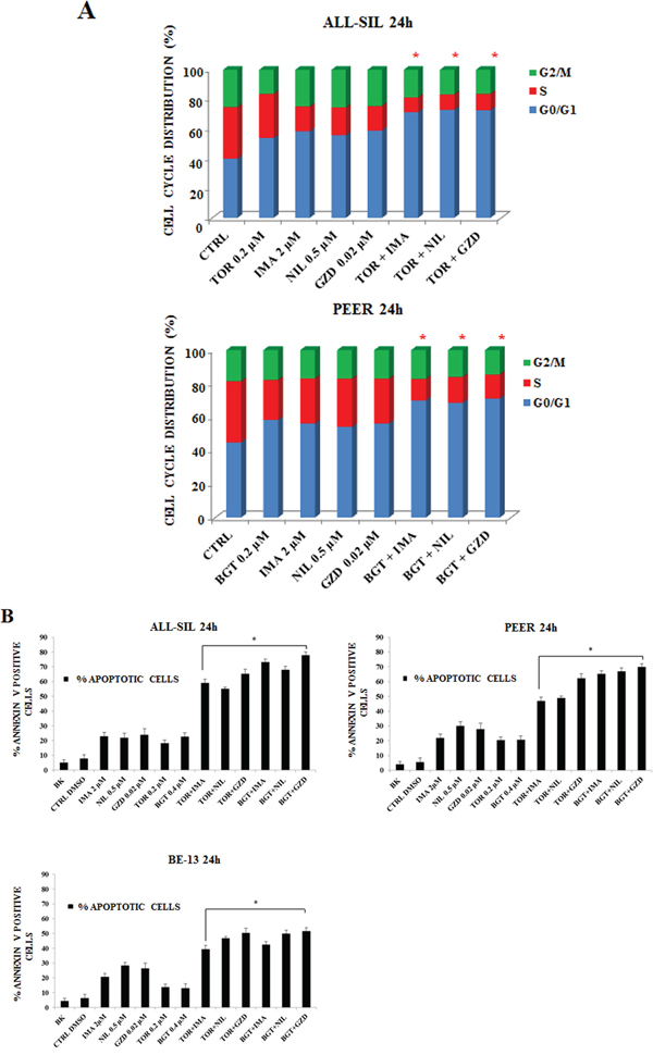 To evaluate whether the drugs could influence cell cycle progression, flow cytometric analysis was performed. Imatinib, Nilotinib and GZD824 were administered alone and in combination with Torin-2 and BGT226 drugs for 24 h. These combinations augmented the G0/G1 cell cycle phase in both ALL-SIL and PEER cells, with a parallel decrease mainly in the S phase (Figure 5A).