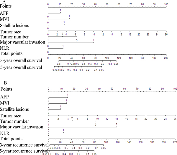 Nomogram is a method that could assign relative risk scores to each predictor according to its contribution to the prognosis. Based on total points of individual, it could predict the probability of overall survival (OS) and recurrence free survival (RFS) after hepatectomy. Recently, many investigators successfully evaluate risk scores to more accurately predict the outcomes in various cancers including HCC. [27–29]. For resectable HCCs after hepatectomy, model incorporating all the available risk factors might increase power in predicting the prognosis of HCCs after hepatectomy.
