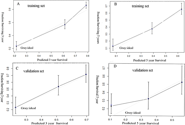 Calibration plots were generated to investigate the performance characteristics of our nomogram at 3 and 5 years after surgery in the training set and the validation set. Nomogram was internally validated using bootstrapping with 1000 resamples. Moreover, we estimate the predictive performance when the models are applied to new patients in the validation set. The predict power between the nomogram and other four current staging systems in the training set and the validation set were assessed using the rcorrp.cens package in Hmisc in R and were shown as the C-index. A higher C-index indicated a higher predict power for HCC. A P < 0.05 was considered statistically significant. All analyses were carried out using R version 3.3.0 with the rms packages (http://www.R-project.org) and SPSS version 20.0 (Chicago, IL, USA).