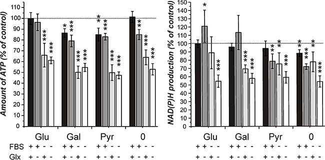 Figure 1: Amount of ATP in cell lysates and NAD(P)H production in cells from the line U87 under different culture conditions. Cells from the line U87 were cultivated for 20 hours at a density of 5000 cells per well in 96-well microplates in DMEM standard culture medium before they received fresh medium with different supplements: FBS: fetal bovine serum, 10%; Glx: GlutaMax, 2 mM; Glu/Gal/Pyr: glucose, galactose, pyruvate: each 25 mM; 0: no Glu/Gal/Pyr. 24 hours later the CellTiter-Glo assay (measuring ATP in cell lysates, left part of the panel) and the CellTiter-Blue assay (measuring NAD(P)H production, right part of the panel) were employed to assess cell viability. Signals obtained from cells cultivated in 25 mM glucose, 10% FBS and 2 mM GlutaMax were set as 100%. Results are presented as mean and standard deviation of 6 wells. Statistical significance was determined by Student’s t-test with: *p < 0.05; **p < 0.005; ***p < 0.0005.