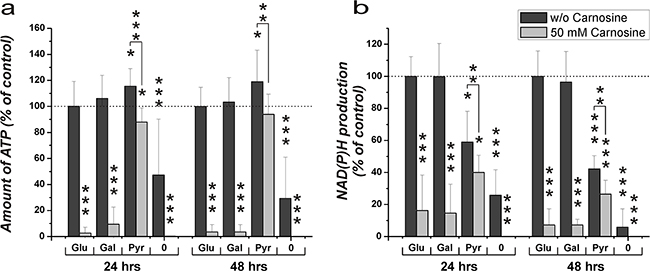 Figure 2: Amount of ATP in cell lysates and NAD(P)H production in the line U87 under the influence of glucose, galactose or pyruvate and carnosine after pre-starvation. Cells from the line U87 were seeded at a density of 5000 cells per well in 96-well microplates and were incubated for 20 hours in medium without glucose, galactose or pyruvate and without FBS and GlutaMax. After 20 hours, medium was substituted for medium with different supplements: glucose (Glu), galactose (Gal), pyruvate (Pyr): 25 mM, no supplement (0); and with or without 50 mM carnosine. 24 and 48 hours later CellTiter-Glo and CellTiter-Blue assays were employed to determine ATP in cell lysates and NAD(P)H production in intact cells. In order to compare the effects of glucose, galactose and pyruvate in the presence and absence of carnosine, results are grouped into data sets with regard to the amount of ATP in cell lysates (A) and dehydrogenase activity (B). Results are represented as mean and standard deviation of 6 wells from three independent experiments for each condition normalized to signals recorded from cells cultivated in the presence of glucose and the absence of carnosine (set as 100%). Statistical significance was determined by Student’s t-test with: *p < 0.05; **p < 0.005; ***p < 0.0005.