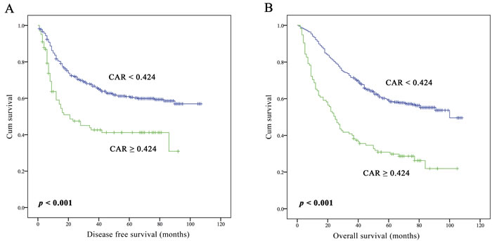 Figure 1: Kaplan-Meier curves of DFS A. and OS B. according to CAR in 617 operable NSCLC patients.