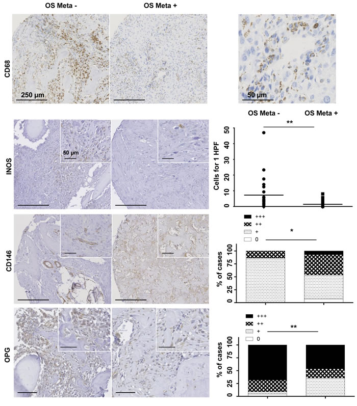 Figure 1: Representative immunohistochemical results of CD68, INOS, CD146 and OPG, in primary lesions of OS Meta- and OS Meta+. The immunohistochemical study was performed on tissue micro-arrays and analyzed on digitized images. Macrophages are the main cells in the bone niche; the qualitatively analysis revealed their perivascular location (Bar scale 250 and 50 µm, original magnification x10 and x40 respectively). Quantitative analysis showed a significantly higher infiltration of M1-polarized macrophages in OS Meta- patients [number of INOS+ cells for 1 high power (x40) microscopic field (HPF) estimated on 3 “hot-spots“; median value symbolized with a horizontal bar] (Fisher test, p = 0.001). On the contrary, OS Meta+ had a significantly higher vascular density (CD146 staining) (Wilcoxon test, p = 0.014) and OPG density was significantly higher in the OS Meta- group (Wilcoxon test, p = 0.028). (Semi-quantitative analysis of vascular or cellular density: 0, no staining; 1, < 1/3 of the surface; 2, between 1/3 and 2/3 of the surface; 3, >2/3 of the tumor surface). OS Meta-: patients with non-metastatic OS; OS Meta+: patients with metastatic OS