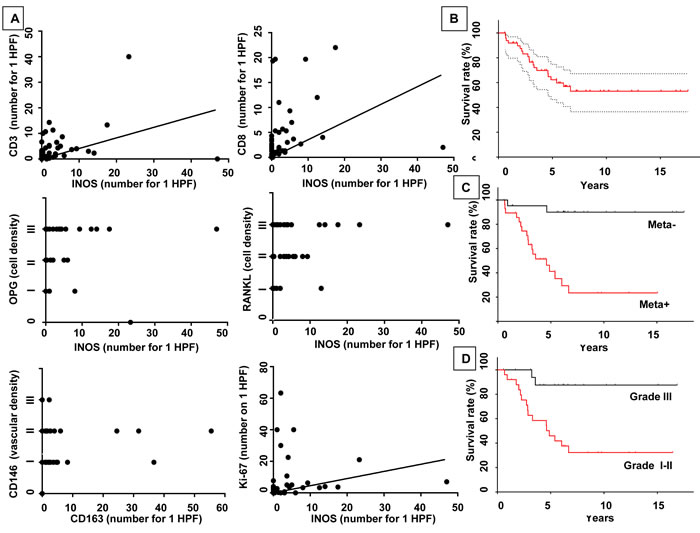 Figure 2: INOS+ M1-polarized macrophages correlate CD3+ CD8+ lymphocytes, OPG, RANKL and the mitotic index and M2-polarized macrophage with the vascularization in primary lesions of OS. A. A positive correlation was found between INOS+ M1-polarized macrophages and CD3+CD8+ lymphocytes, OPG, RANKL and the mitotic index (Spearman correlation, p = 0.00151, p = 0.03131, p = 0.0150, p = 0.00218 respectively). M2-polarized macrophages as determined by CD163+ cells, were correlated with vascularity as determined by CD146+ cell density (Spearman correlation, p = 0.00154). Kaplan-Meier Curve of survival, according to presence of metastasis at diagnosis, and of response to chemotherapy: B. Median overall survival was 5.12 years (95%CI: 4.62-7.12). C. Patients with metastasis (synchronous or metachronous) were associated with significantly lower median overall survival [3.26 years (95%CI: 3.78-7.18)], p < 0.001. D. Patients with a worse histological response to chemotherapy [defined as < 90% of tumor necrosis after neoadjuvant chemotherapy] were associated with worse overall survival [4.61 years (95%CI: 3.78-7.18)], p < 0.01. Meta-: non-metastatic patients; Meta+: metastatic patients; Grade III, I-II according the Huvos score.