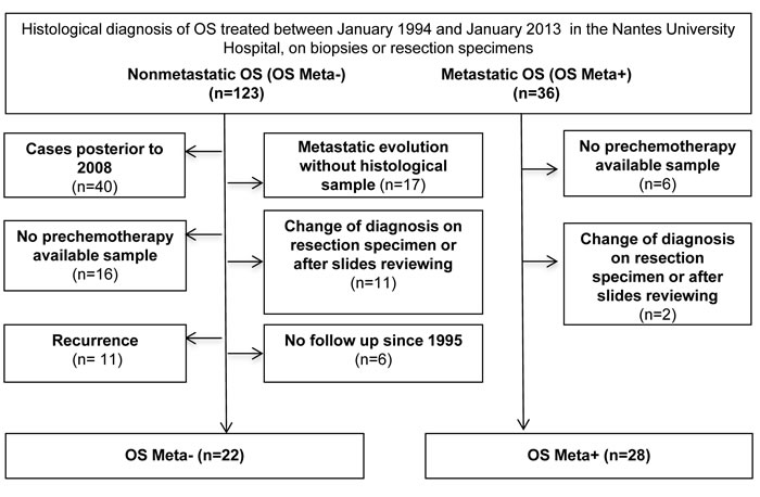 Patient data were collected from the pathology database at the Nantes University Hospital (France). The experimental procedures were carried out in accordance with both the ethical standards of the responsible institutional committee on human experimentation, and with the Helsinki Declaration (Authorization: French Research Ministry n° 2008-402). All patients with OS treated between January 01, 1994 and January 01, 2013, for whom paraffin-embedded tissue blocks of primary tumors were available, were included. The inclusion and exclusion criteria are summarized in Figure 3. Patients without pre-chemotherapy samples (diagnosis made in another center or in resection specimens) and patients whose diagnosis changed following resection of the specimens or reviewing the slides were excluded. For non-metastatic patients, those with local recurrence, or without follow-up were excluded and a minimum of 5 years’ follow-up was required. Two cohorts were finally formed: patients with non-metastatic OS (OS Meta-) and patients with metastatic OS (OS Meta+). For all patients, the following data were collected retrospectively using electronic or paper files, or, if necessary, through direct telephone contact with the general practitioner: demographic data, tumor location, treatment, metastasis (location, synchronous or metachronous) and death (date and cause).