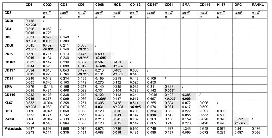 After systematic optimization of antigen retrieval and antigen detection by primary antibody on human placenta samples decalcified with nitric acid or electrolysis, the following antigens were studied: CD68, pan-macrophages; INOS, M1-macrophage subtype; CD163, M2-macrophage subtype; CD3, CD4 and CD8, T lymphocytes; CD20, B lymphocytes; CD117, mast cells; CD31, CD146, and smooth muscle actin (SMA) for endothelial and perivascular cells; OPG; RANKL and MIB-1 (Ki-67 index) (Supplementary Table 1). CD3, CD4, CD8, CD20, CD68, CD117, SMA, CD31 and Ki-67 antigen were detected using a fully automated immunohistochemical device (DAKO Autostainer Link 48) associated with the Dako EnVisionTM Flex detection system. Immunoreactivity was detected by DakoEnVisionTM FLEX DAB+ Chromogen. The immunoreactivity of CD146, INOS, OPG and RANKL were analyzed using a manual technical process. After deparaffinization and rehydration of the tissue sections, antigen retrieval was carried out at 96°C for 20 h in EDTA or citrate buffer (LabVisionTM PT Module, ThermoScientific). Endogenous peroxidase was blocked with hydrogen peroxide followed by blocking the non-specific antibody. Then, the corresponding primary antibody was deposited, antigen positivity was revealed with DAB chromogen and tumor sections were counterstained with hematoxylin. The negative control was analyzed using a similar procedure, excluding the primary antibody and using a normal rabbit-irrelevant IgG (R&D Systems). TMAs slides were scanned and the images were automatically digitized (Nanozoomer, Hamamatsu photonics) before quantification. Immunoreactivity was analyzed qualitatively (cell type, location, nuclear / membrane / cytoplasmic staining) and semi-quantitatively. Semi-quantification was done according to the following criteria: i) for the immune cells: number of cytoplasmic stains on 3 high power (x40) microscopic fields (HPF) in “hot-spots” (areas with high cellular density) per core sample; ii) for vascular, tumor cell density and OPG/RANKL positivity: 0, no staining; 1, < 1/3 of the surface; 2, between 1/3 and 2/3 of the surface; 3, > 2/3 of the surface; iii) for tumor cell proliferation: number of MIB-1 nuclear stains on one HPF. For each case, the mean of the values in the three core samples was performed, and the higher value for vascular or cellular density was selected. For observations and semi-quantifications, a double-blind examination by two experienced pathologists was carried out.
