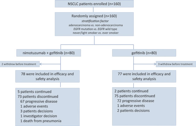 A total of 160 patients were enrolled between Feb. 2012 and Jun. 2014 at 6 centers in Korea. Of 160 patients, 80 were randomly allocated to the gefitinib and 80 patients were assigned to nimotuzumab plus gefitinib. Five patients (2 in nimotuzumab plus gefitinib 3 in gefitinib arm) withdrew consent before treatment. Finally, 155 patients received at least one dose and could be evaluated for efficacy and toxicity in this study. Progressive disease was confirmed in 139 patients by the data cutoff point of March, 30th 2016 (Figure 1).