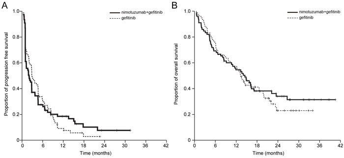 There are several potential reasons for the lack of variation in outcomes between combined- and mono-therapy. Firstly, the affinity of nimotuzumab is ~10 times lower than those of cetuximab and necitumumab, and thus this lower affinity of nimotuzumab might cause the negligible blocking effect of the EGFR pathway seen in our study [13]. Additionally, the small number of enrolled patients, slight imbalance in prognostic factors between the two treatment arms favoring the gefitinib arm, and lack of patient selection based on EGFR expression could have led to the negative findings. The percentage of EGFR mutation was quite high in the gefitinib arm; although this difference was not statistically significant, it may have had an impact on treatment outcomes in this clinical trial.