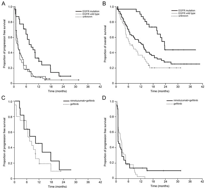 In contrast to previous studies, in our study, treatment with the EGFR monoclonal antibody nimotuzumab did not prolong survival in squamous cell lung cancer patients. In patients who had acquired resistance to EGFR-TKI, dual blockage of EGFR with afatinib and cetuximab demonstrated robust clinical activity in both those with and without T790M mutations [25]. This result implicated that a significant portion of tumors in patients with acquired resistance to gefitinib or erlotinib still remain dependent on EGFR signaling for survival. Therefore, more complete blockade of EGFR is an effective strategy that could be worthwhile for further study in EGFR mutated patients with acquired resistance.