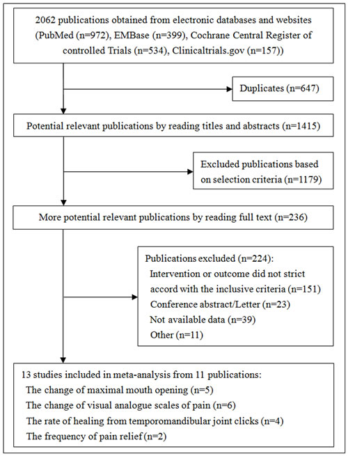 The 13 eligible studies included a total of 538 patients. The change in maximal mouth opening (MMO) was determined for 122 patients from 5 studies [10, 18, 20, 23], and the initial scope of MMO was categorized to three levels: less than 37 mm, 37 mm to 45 mm, and greater than 45 mm. The change in the amount of pain experienced, as reported using the visual analogue scale (VAS), was assessed in 285 patients from 6 studies [19-22, 25]. Three types of disorder were assessed: TMD without specific description (TMDSD) [21, 22, 25], osteoarthritis [20], and TMJ clicking [19]. The rate of healing from TMJ clicking was recorded in 170 patients from 4 studies [19, 26, 27]. The frequency of pain relief was evaluated in 112 patients from 2 studies [22, 24]. There were 5 studies [18, 20, 22, 23, 25] missing standard deviations (SD), which were estimated from the P-values. Table 2 describes the clinical characteristics of patients in all 13 studies.