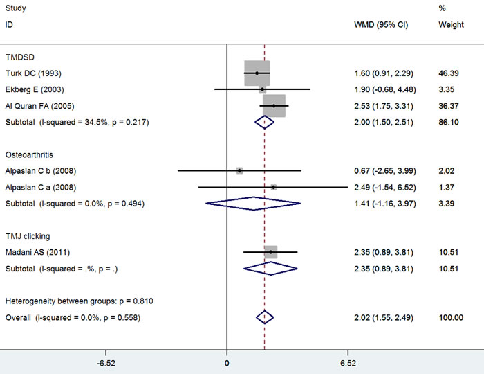 Comparison of the splint therapy and control groups also revealed a significant difference in the changes in level of perceived pain, as determined using the VAS (Figure 3) (MD = 2.02, 95% CI [1.55, 2.49], I2 = 0%, P = 0.558). Subgroup analysis showed that patients with TMDSD in the splint therapy group experienced a significant decrease in pain as compared to control (MD = 2.00, 95% CI [1.50, 2.51], I2 = 34.5%, P = 0.217). This was also the case for patients with TMJ clicking (MD = 2.35, 95% CI [0.89, 3.81], I2 = NA, P = NA), but not for patients with osteoarthritis (MD = 1.41, 95% CI [-1.16, 3.97], I2 = 0%, P = 0.494). On the other hand, meta-regression revealed no significant differences in the change in VAS for pain after adjusting for baseline and possible confounding factors (Table 4).