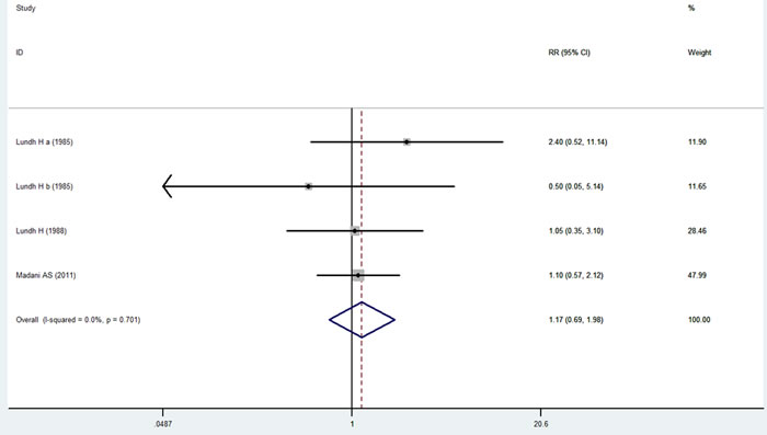 Comparison of the splint therapy and control groups using a fixed-effects model showed that there was no significant difference in the rates of healing from TMJ clicking between the two groups (Figure 4) (RR = 1.17, 95% CI [0.69, 1.98], I2 = 0.0%, P = 0.701).