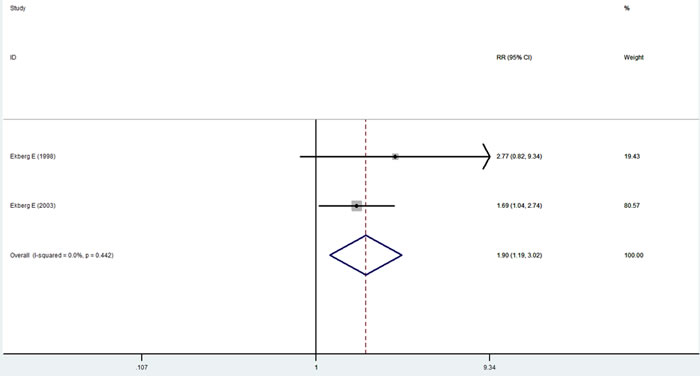 Comparison of the splint therapy and control groups using a fixed-effects model showed that splint therapy significantly reduced the frequency of painful episodes in patients with TMJ clicking (Figure 5) (RR = 1.90, 95% CI [1.19, 3.02], I2 = 0.0%, P = 0.442).