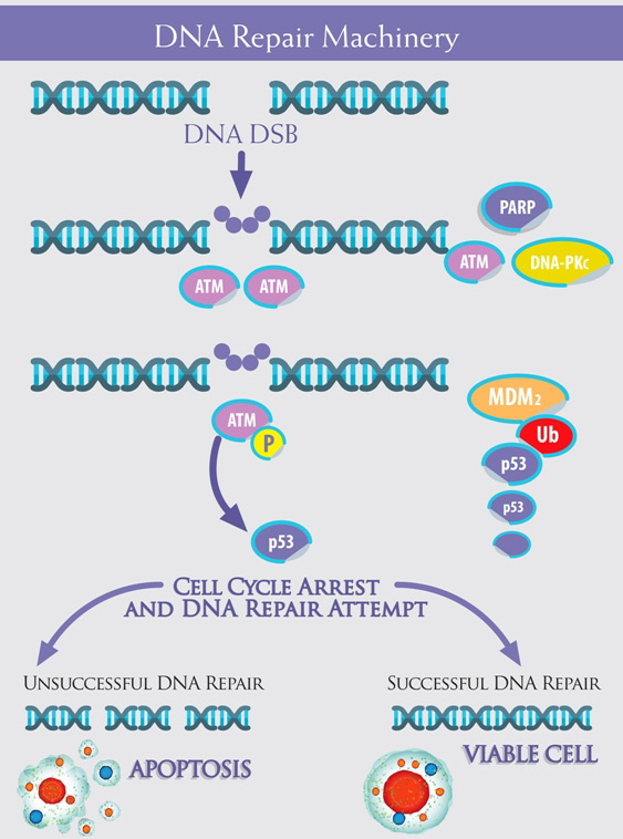 Figure 1: The machinery is composed of multiple “devices”, which cooperate from the detection of DNA damage to the cellular response. ATM acts as protagonist, together with PARP, in the so-called “error-free” DNA repair Homologous Recombination - HR -, whereas DNA-PKc is the pivot in the “error-prone” Non Homologous End Joining - NHEJ. ATM ( Ataxia Telangiectasia Mutated) is present in form of inactive dimers or polymers within the cell: DNA Double Strands Breaks - DNA DSB - trigger ATM phosphorylation, with dimers dissociation: activated ATM monomers phosphorilate p53, which arrests cell cycle in expectation of DNA repair. With a successful repair, the cell remains viable, whereas , if the DNA Repair fails, p53 trigger the apoptotic cascade. p53 is down regulated by Mdm2, which lead to its degradation in an Ubiquitin-dependent process.