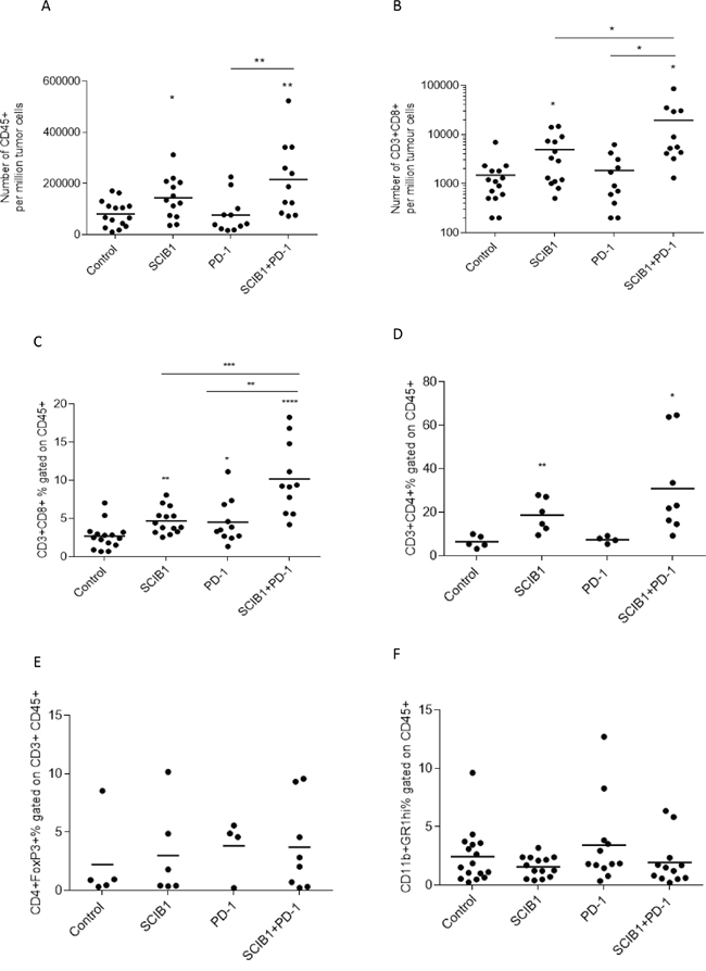 Figure 4: Combination of SCIB1 vaccine with PD-1 blockade increases T cell infiltrate into tumors. Tumors from untreated mice or those treated with SCIB1, PD-1 blockade or the combination were assessed for A. Number of CD45+ T cell infiltrate per million tumor cells; B. Number of CD8+ T cell infiltrate per million tumor cells; C. CD3+CD8+ T cell infiltrate as a % of CD45+; D. CD3+CD4+ T cell infiltrate as a % of CD45+; E. Treg (CD4+FoxP3+) infiltrate as a % of CD45+CD3+; F. MDSC (CD11b+GR1hi+) infiltrate as a % of CD45+. Analysis of (A) and (B) is gated on the whole tumor cell population. Analysis of (C-F) is gated on CD45+ population while (E) is gated on CD45+CD3+ population (*, P<0.05; **, P<0.01; ***, P<0.001; **** p<0.0001). Results are a combined from at least 2 independent studies in which n≥5.