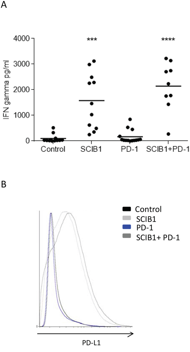 Figure 6: Analysis of TIL function and PD-L1 expression on tumor in mice immunized with single or combination vaccines. A. TILs from mice immunized with SCIB1, PD-1 blockade or combination were assessed for IFNγ release in response to anti-CD3 stimulation measured by ELISA. Results are combined data from at least two independent studies where n≥5 (***, P<0.001; ****, p<0.0001). B. PD-L1 expression within tumor environment where analysis is gated on whole tumor sample and shows representative data n≥3.