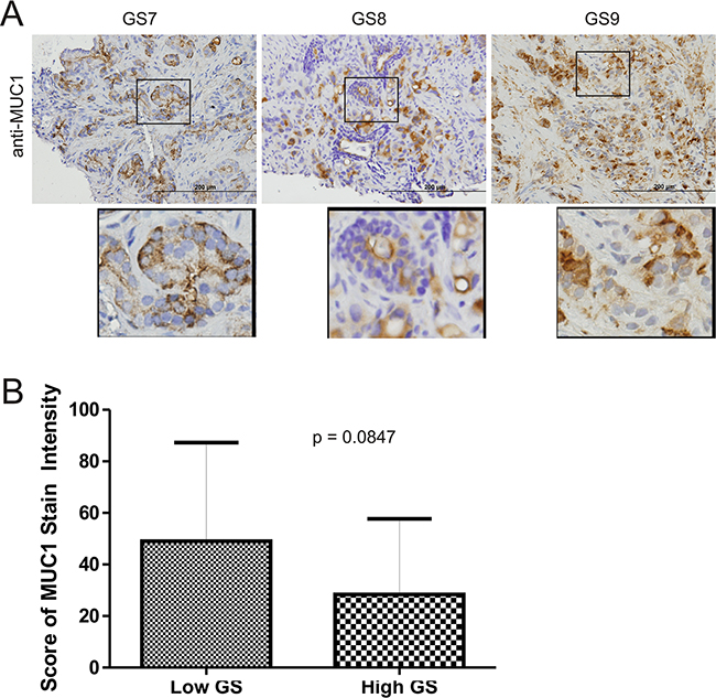 To further study the above association, we have examined MUC1 protein expression in 34 primary PCs consisting of 13 low (GS6-7) and 21 high grade PCs (GS8-10) (Table 1). By using an anti-MUC1-N antibody (BD), MUC1 presence was clearly detected in PC tumors (Figure 3A), but with variable levels (Table 1). MUC1 expression was not greater in high grade PCs than low grade PCs (Figure 3B) as we had expected. Tumor cells can shed off MUC1-N [17], making this a possibility for PCs without detectable staining. To test this scenario, we examined 14 primary PC slides from our PC cohort (Table 1) and an additional 6 primary PCs side-by-side using an anti-N or anti C-terminus antibody. For staining with either antibody, we observed PCs with 1) high intensive staining for both antibodies; and 2) importantly, a low level of staining for MUC1-N but intensive staining for MUC1-C (Supplementary Table S1, Supplementary Figure S2). These observations thus support that the lack of detectable staining for the N-terminal fragment is due to potential shedding of MUC1-N.