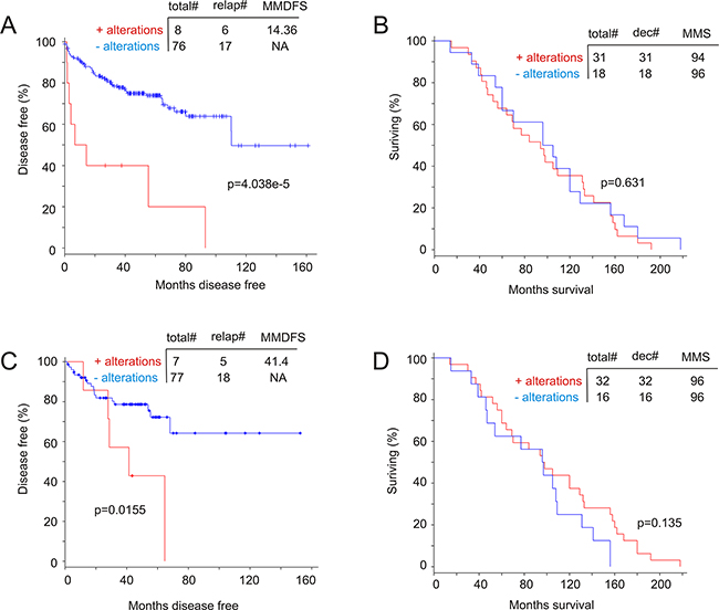 Figure 10: Genomic alterations in the MUC1 network associate with a reduction in disease free survival (DFS). A dataset of primary PC [42] A, C. and a dataset of metastatic PC [41] B, D. within the cBioPortal database [44, 45] were used to assess the impact of the MUC1 network on DFS (A) and OS (B) as well as the effects of the AR network on DFS (C) and (D). Statistical analysis was performed using logrand test. Total#: total number of cases; relap#: number of relapsed cases; dec#: number of deceased cases; MMDFS: median months disease free survival; MMS: median months survival; NA: not available.