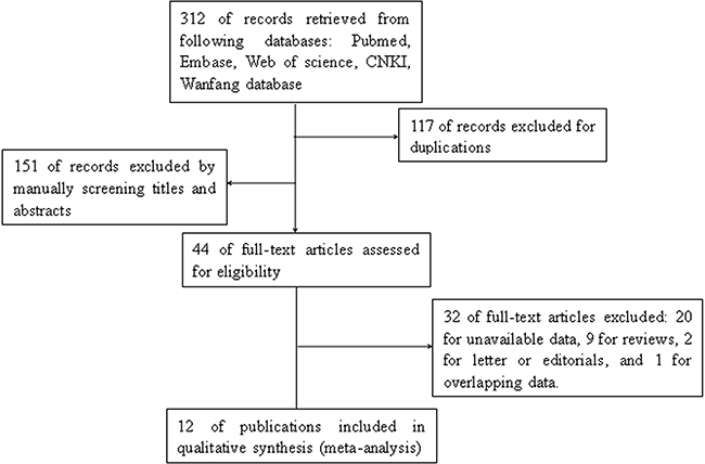 Exclusion criteria: (1) duplicate publications; (2) studies without available data; (3) overlapping data; (4) reviews, letters, case reports and expert opinions.