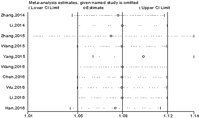 In 12 included studies, 10 studies reported the prognosis of OS according to H19 expression levels, with a total of 1234 patients. There was no significant heterogeneity among studies (I2=38.6%, Ph=0.101). The fixed-effects model was adopted to calculate the pooled HRs with corresponding 95% confidence intervals (CIs). The HRs was expressed as high H19 expression group versus low H19 expression group, which was 1.08 (95% CI: 1.05-1.12, p< 0.001) (Figure 2).