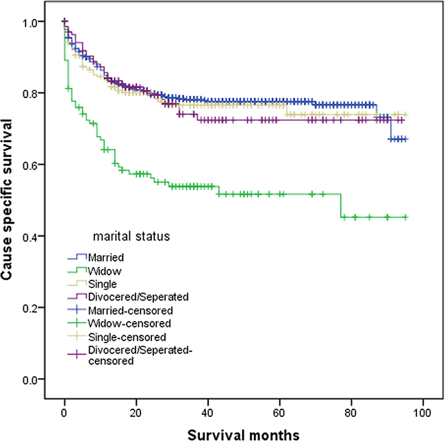 The other hypothesis for the impact of marital status on CSS considered marriage as a means of social support. Cancer diagnosis and treatment induce acute and chronic stress, which may cause poor adherence to medical interventions [15]. Meta-analyses confirmed that patients with depression have an increased death rates with range from 19% to 39% [16, 17]. A behavioral research suggests that cognitive, behavioral and social factors are of great importance in promoting the customization to active treatment and throughout cancer survivorship, which forms the fundamentals for the application of many psychological and social supportive interventions in patients with cancer [18]. The loss of social support or the inability to cope with stress in the widowed group seems very apparent, which may lead to excess mortality [11].