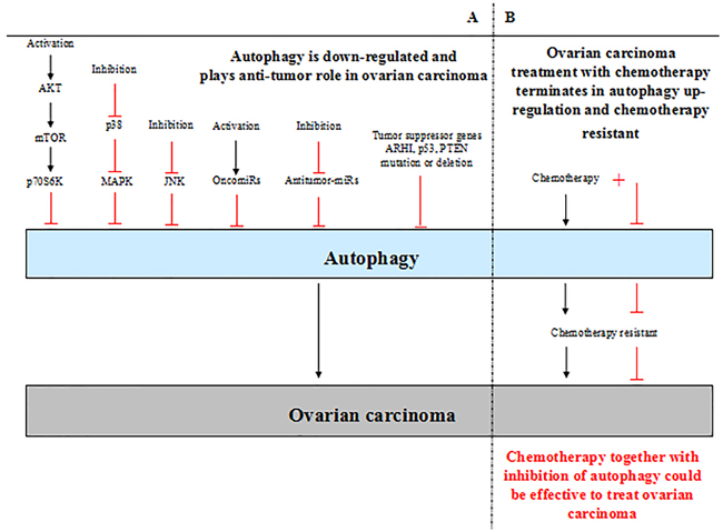 Figure 2: A. Autophagy plays dual roles in ovarian carcinoma. The level of autophagy is down-regulated in ovarian carcinoma generally. In such context, autophagy plays an anti-tumor role in ovarian carcinoma; low level of autophagy contributes to ovarian carcinoma develpoment. The activation of AKT/mTOR signaling pathway and inhibition of p38 MAPK and JNK signaling pathways lead to low level of autophagy in ovarian carcinoma. Furthermore, activation of oncomiRs inhibit autophagy directly, inhibition of antitumor-miRs also lead to down-regulation of autophagy. In addition, the tumor suppressor genes mutation or deletion causes inhibition of autophagy in ovarian carcinoma, such as ARHI, p53, PTEN. B. In the context of ovarian carcinoma treatment with chemotherapy, autophagy is up-regulated and terminates in chemotherapy resistant. Chemotherapy together with inhibition of autophagy could inhibit chemotherapy resistant and be effective to treat ovarian carcinoma.