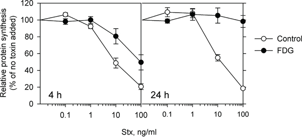 Figure 1: FDG protects cells against Stx. Cells were incubated with or without 1 mM FDG for 4 and 24 h followed by incubation with 10-fold serial dilutions of Stx for 3 h in the presence or absence of FDG, and protein synthesis was measured. The graph shows mean ± SEM from four independent experiments.